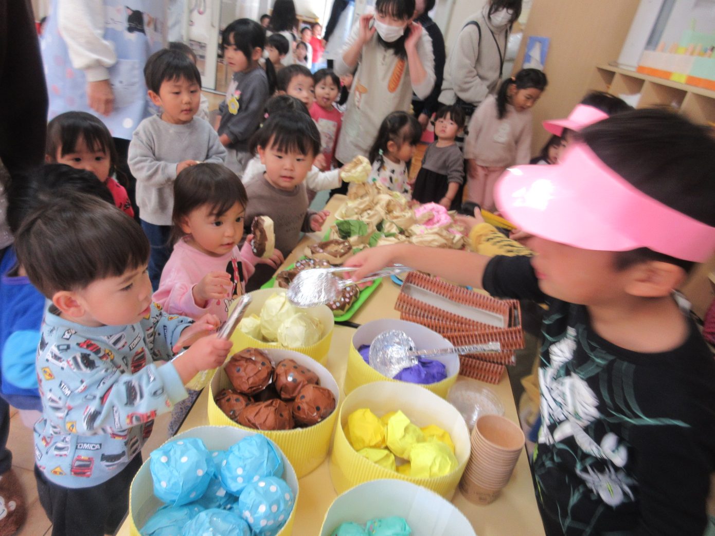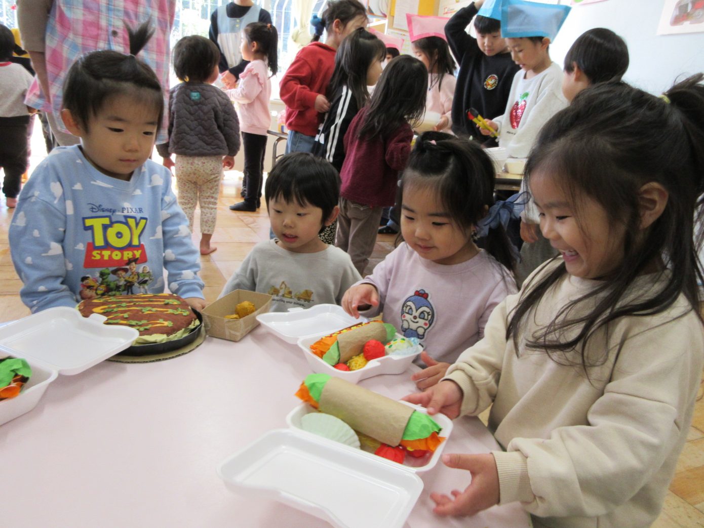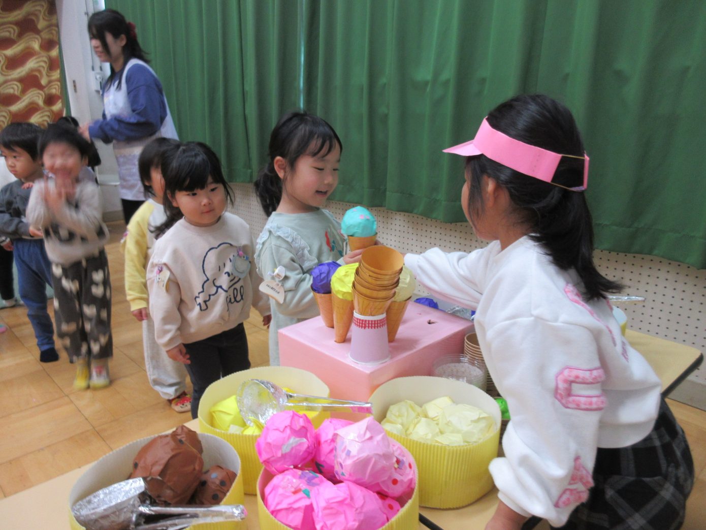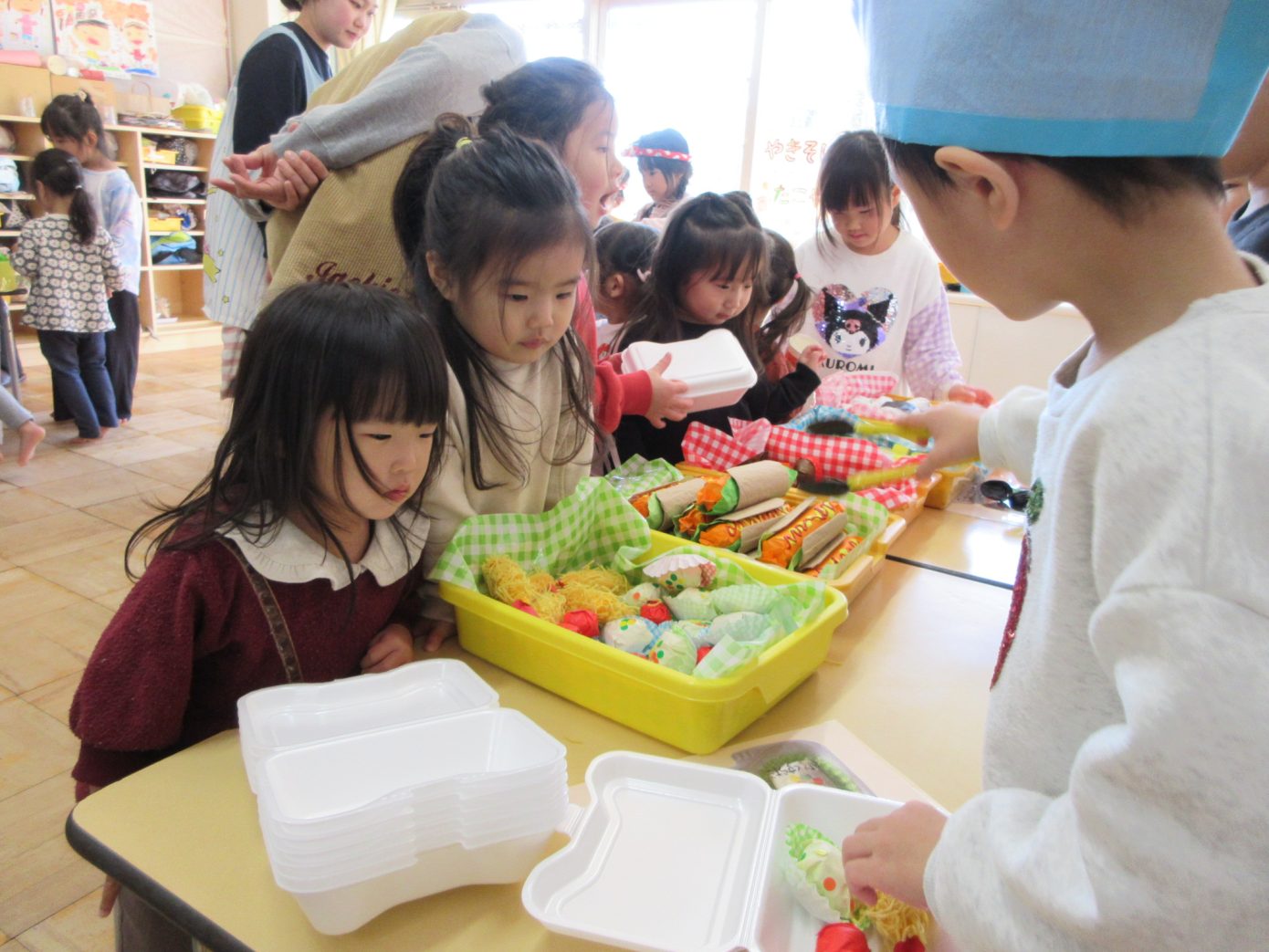 9日(火)には、未満児クラスがお店屋さんごっこに参加をしました。慣れない場所や雰囲気に緊張する様子もありましたが、優しく話しかけてくれたりお手伝いをしてくれたりする年長さんに安心をして、それぞれの楽しみ方を見つけてごっこ遊びを満喫することができました。保育者と一緒に売り買いを経験したりお買い物した食べ物をモグモグと食べる真似をしたりして楽しむ姿がありました。